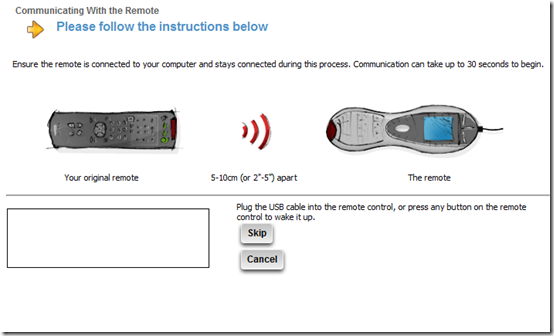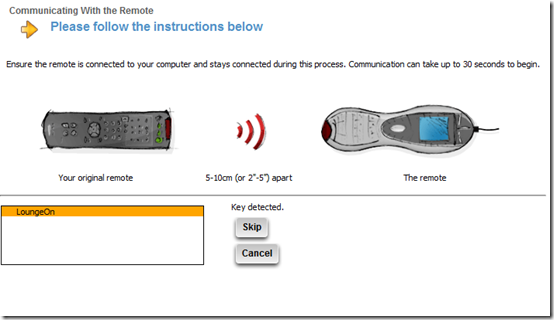 Now position your Harmony remote control handset and your MCE IR Keyboard, so you can teach the Harmony remote the new keyboard shortcut.
