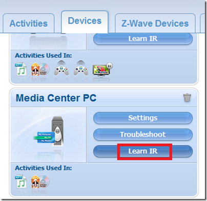 When I was using Windows Media Center, I was able to program my Logitech Harmony universal remote controls to control my Z-wave lights and devices in Micasaverde Vera, I wrote about that back here. And also here for mControl.